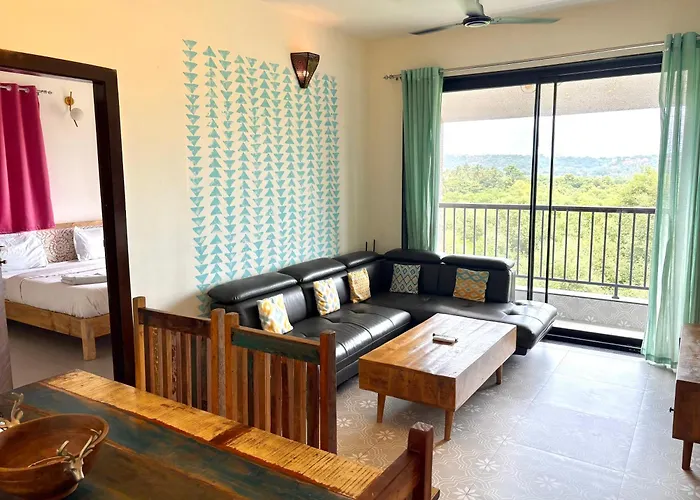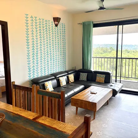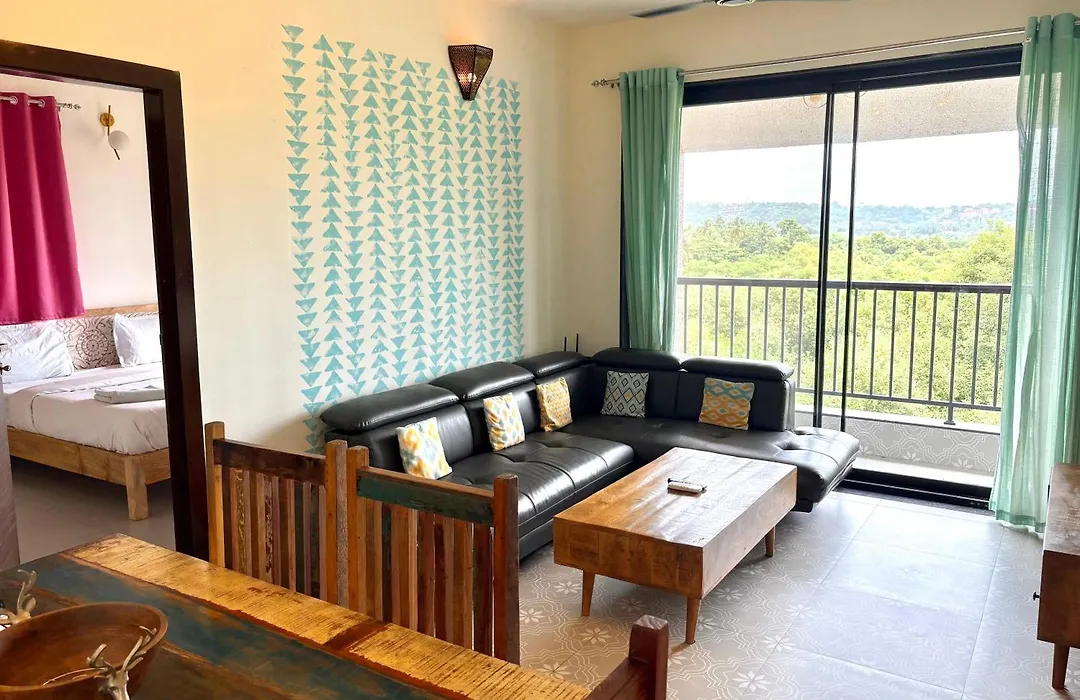 North Goa Escape 2Bhk Family Apartment With Balcony & Pool - Near Candolim Beach has a balcony, a living room, and a fully equipped kitchen, and comforts such as climate control and a washing machine.